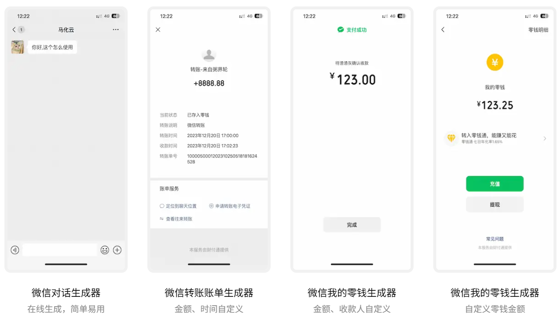 该工具不仅简单易用,而且功能丰富。用户可以选择不同的功能,如微信对话生成器、微信转账账单生成器和微信我的零钱生成器等,根据需求自定义截图内容。